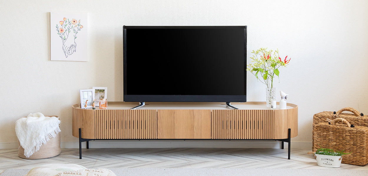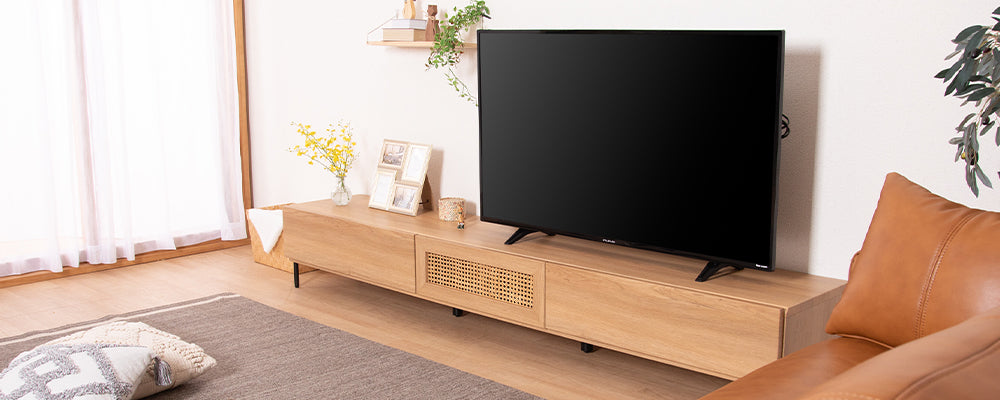 ナチュラルな雰囲気を感じさせる CEBUテレビボード。木目調の優しい風合いと、ラタンがおしゃれ、生活感をそっと包み込むデザインです。
