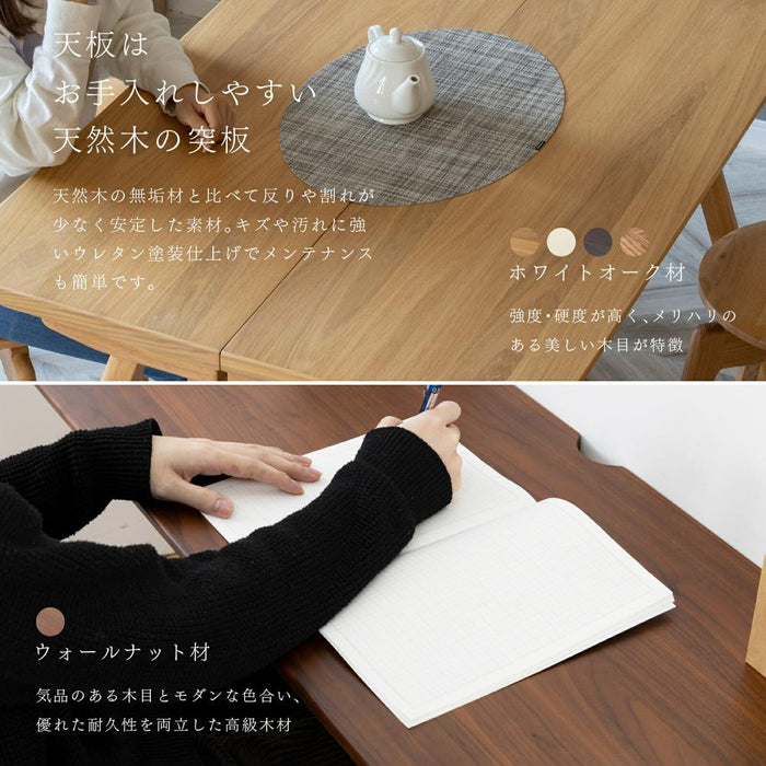 | テーブル天板:ホワイトオーク突板/ウォールナット突板 テーブル脚:ラバー材 チェア:タモ材 |