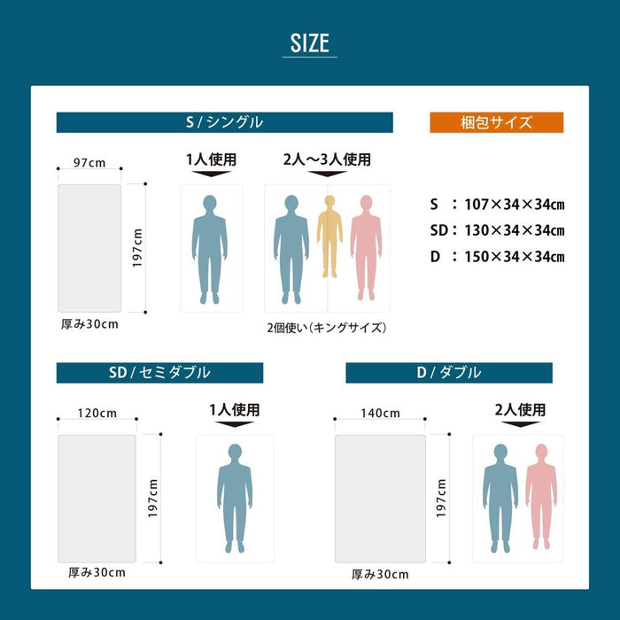 | シングル:幅97×奥行197×高さ30.3cm(20.6kg) セミダブル:幅120×奥行197×高さ30.3cm(26.2kg) ダブル:幅140×奥行197×高さ30.3cm(29.6kg) |