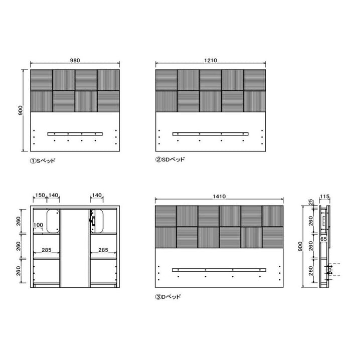 | ヘッドボード前面:ラバー材 内装/サイドフレーム表面:コート紙 床板:桐無垢材 | |