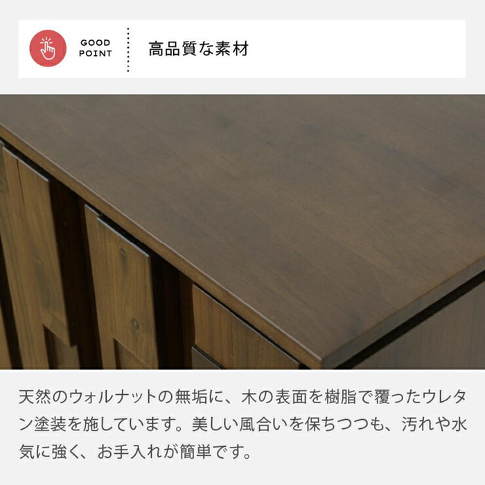 [前板表面材]ウォールナット無垢材(ウレタン樹脂塗装) [天板・側板]ウォールナット突板(ウレタン樹脂塗装) [内装]プリント紙化粧繊維板 [ガラス]5mm強化ガラス(ウォールナット突板貼/ウレタン樹脂塗装) [引き出しレール]フルオープンレール |
